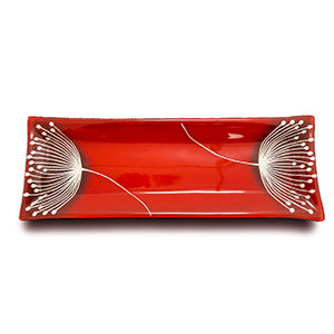 Introducing the Dandelion Medium Snack Plate. Each plate is beautifully hand painted with a dandelion design and measures 30.5cm x 11cm before firing. Perfect for serving up your favorite snacks in style. Elevate your snack game with these unique and eye-catching plates.